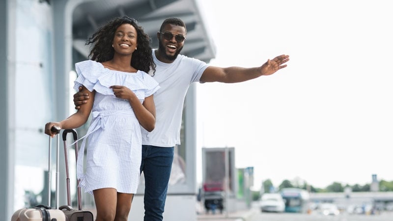 Smiling man and woman with suitcases at the airport